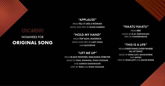 Nominasi Oscar 2023 sudah diumumkan. Untuk Best Original Song nominasinya adalah ‘Applause’, ‘Hold My Hand’, ‘Lift Me Up’, ‘Naatu Naatu’ dan ‘This Is A Life’. Ini merupakan nominasi Oscar pertama untuk Rihanna dan yang ke-4 untuk Lady Gaga.